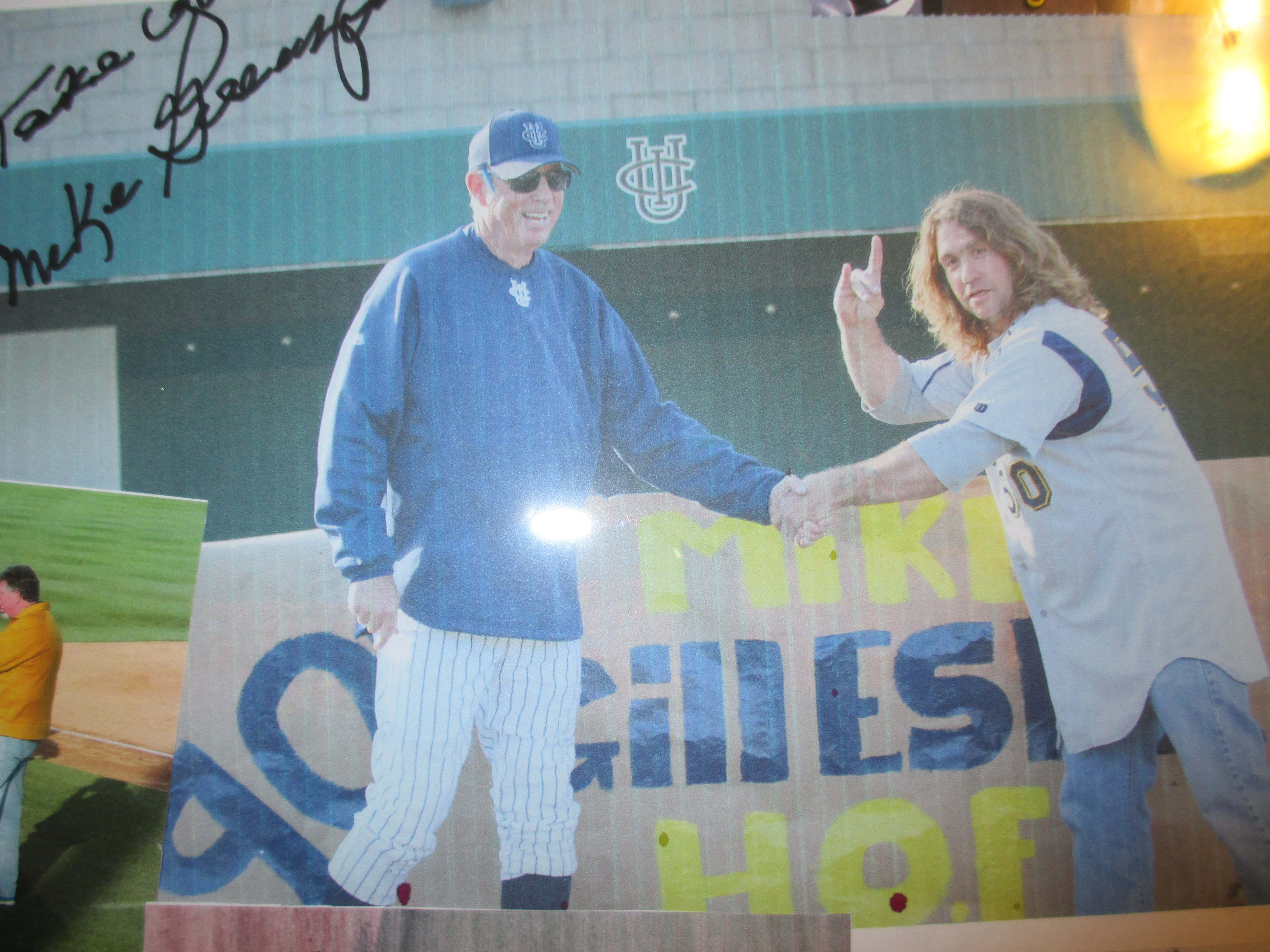 “There are many slickers here among us that are all dressed up in suits and ties. But don’t you show your pain, Lord in front of them ‘Cause if you do you kiss yourself goodbye, alright”. The words of the immortal legend Mr. Ronnie Van Zandt coursed through my veins as I released my defiant soliloquy my pain bleeding out as anger escaping through the portal of frustration. Too many times had I went to extremes in commemorating and celebrating important events in Anteater Baseball lore only to be shut down like a trench coat pervert in a park. Crushed, by finding a sign I made to bring attention to the National Titles, since the school banners were no longer hanging, torn down and shoved under the stairs of the press box. Was it the statistical facts and the acknowledgment of history on the sign that caused you shame? Was it the school colors represented on the sign with custom mixed paint or was it just too ghetto for them, I don’t know. So here we are another sign with that same paint marking a mile stone in a rated G respectful manner. No belligerent field rush at the end of the game, no lack of communication from my side just a salute from the stands and when the teams left the field a phantom picture was taken that I will never see. I can’t explain why a picture showing two men smiling and shaking hands would be viewed as contempt by others.